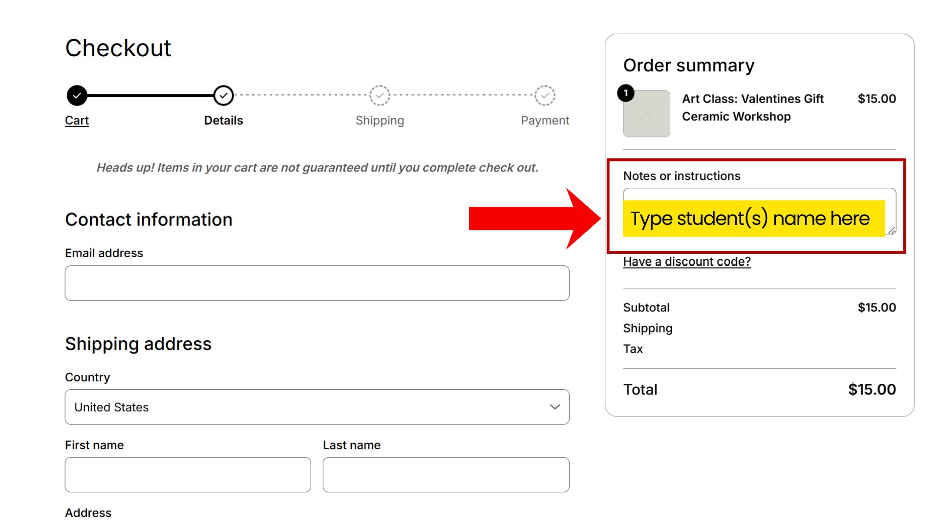 Please list your student's name in the "Notes or Instructions" field (see image for details)
