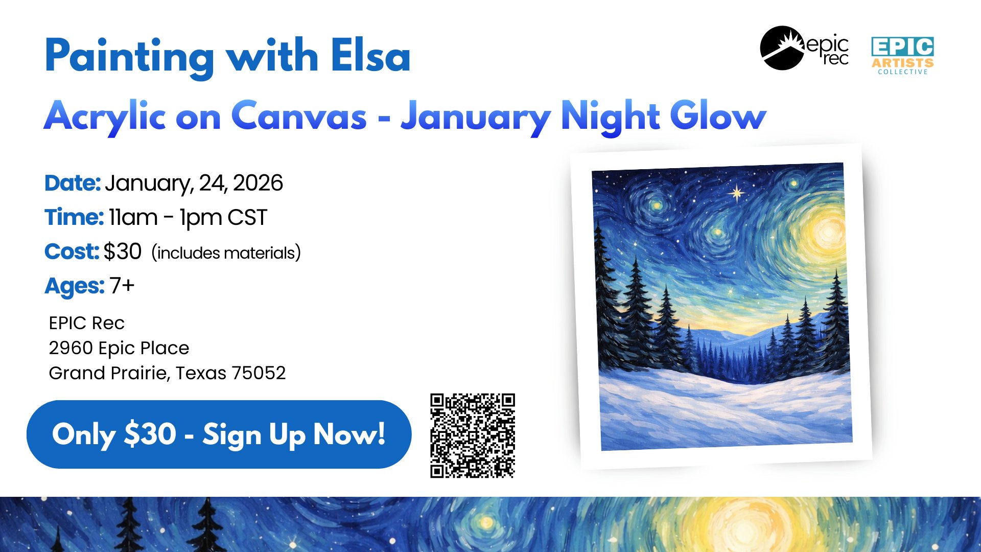 Join Elsa for a festive acrylic painting session where you'll create your own January Night Glow masterpiece to take home! This beginner-friendly workshop provides all materials and step-by-step guidance, so no experience is needed, just bring your creativity and holiday spirit. Perfect for anyone looking to unwind, try something new, and celebrate the season with art!